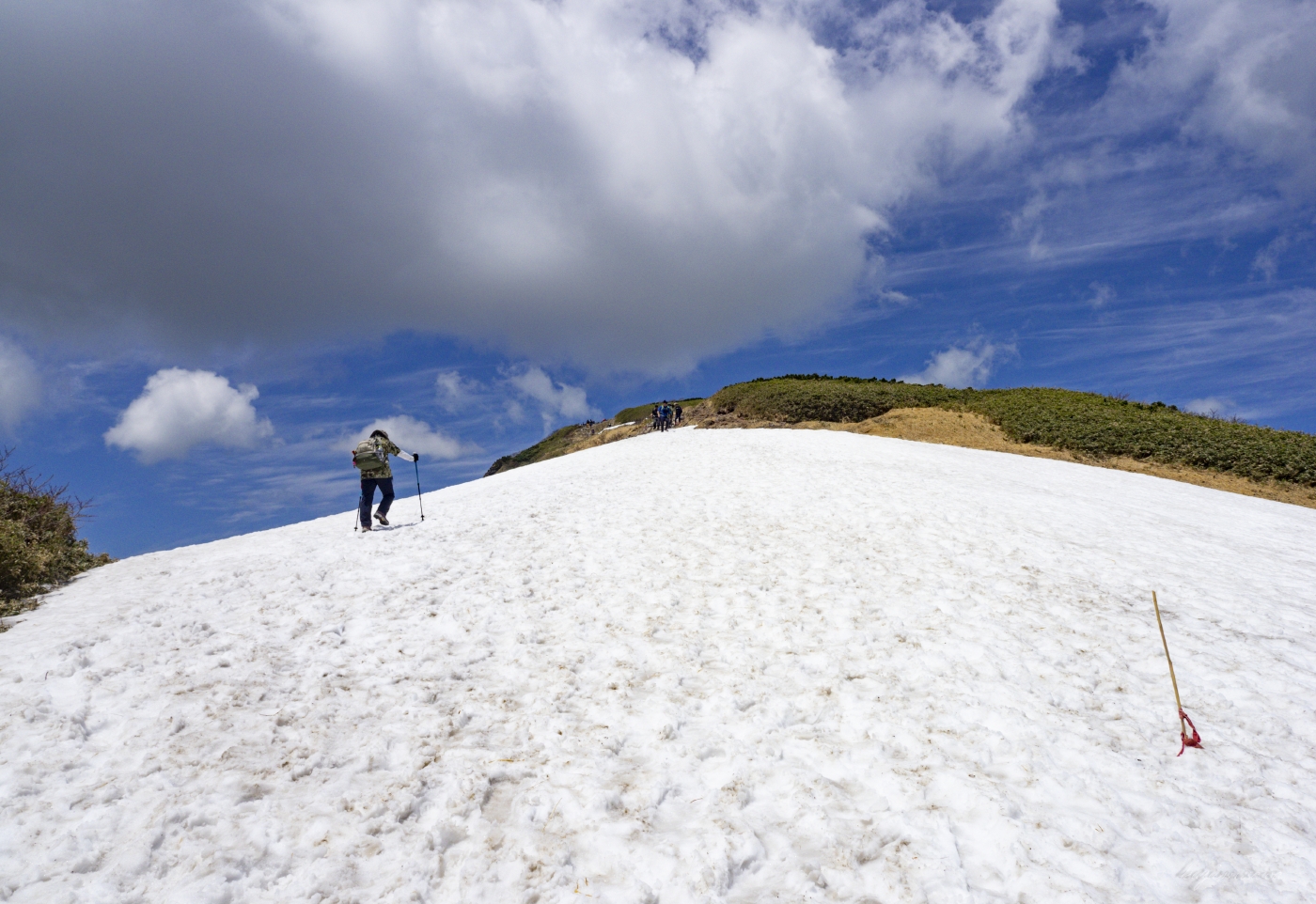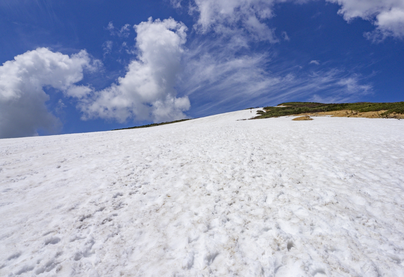 山頂への雪渓に多くの登山客が豆粒のように見えます。