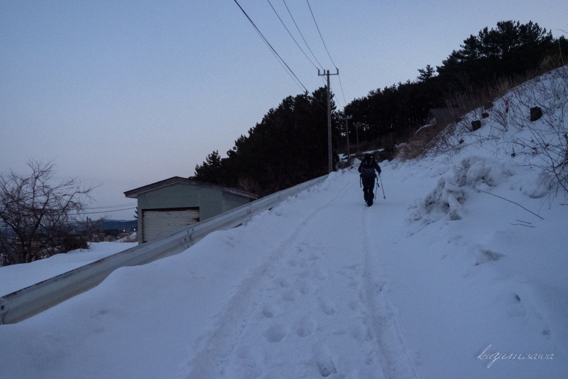国道から登山口の手前まで車でも行けたかもしれないが、少し雪が深いようだったので国道101号からのスタート。
