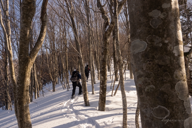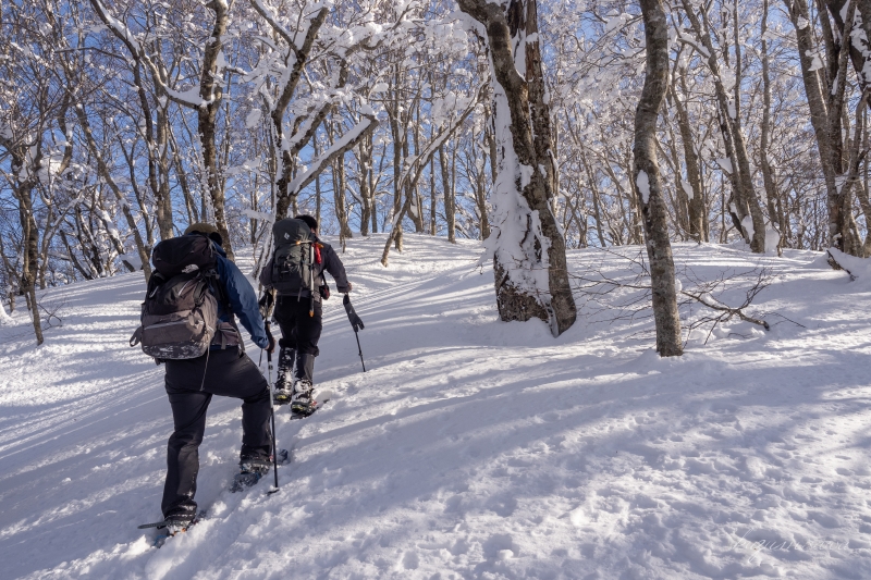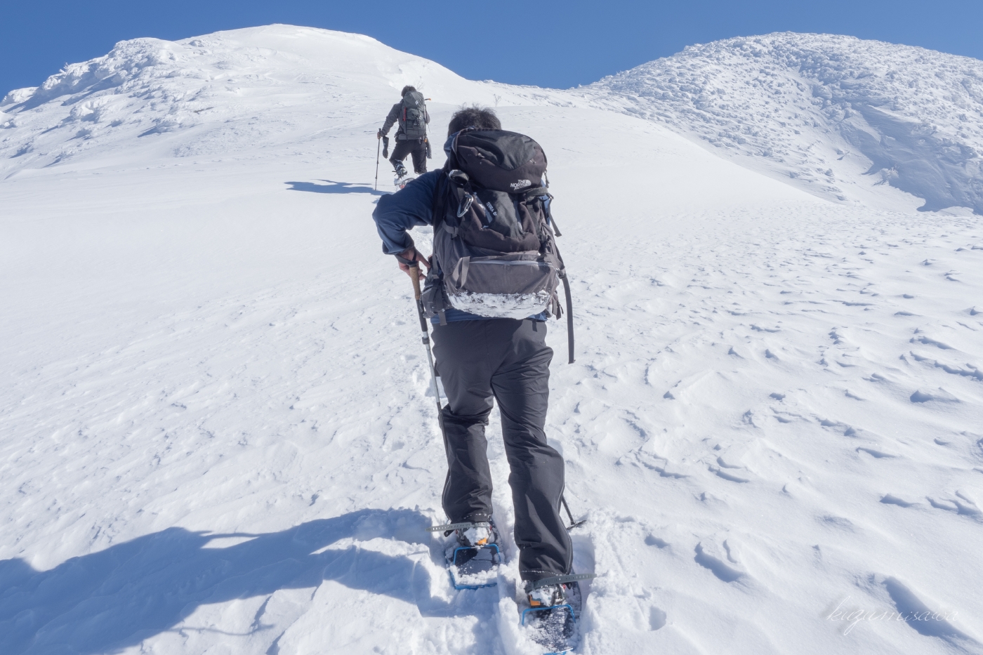 一部壁のような急登があるが、スノーシューでキックステップを作りながら登る。