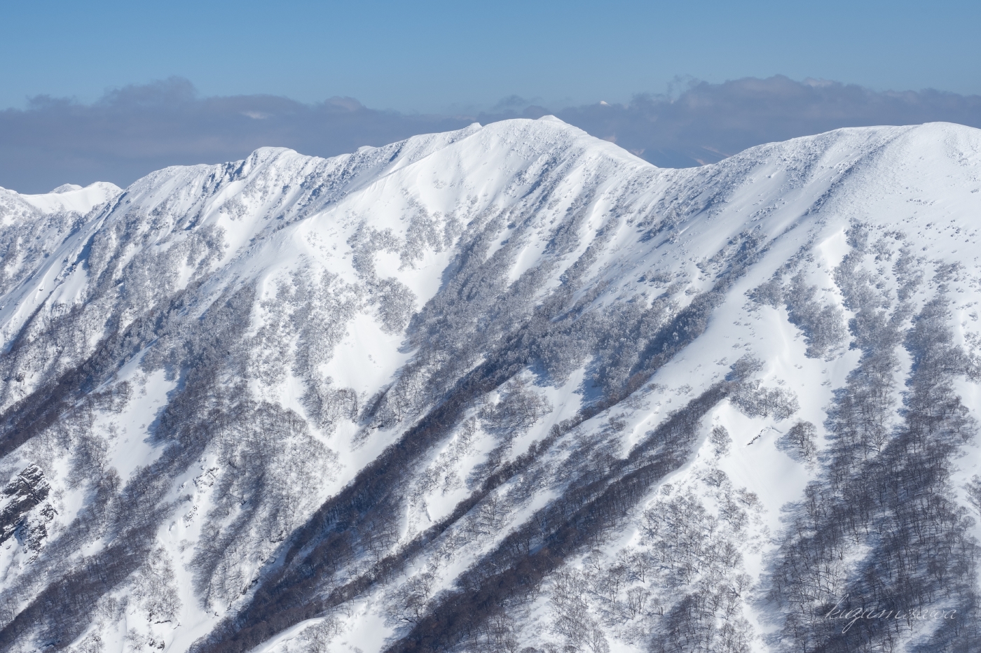樹林帯を抜けると展望が良くなり、白神岳の主稜線が近くに見える。