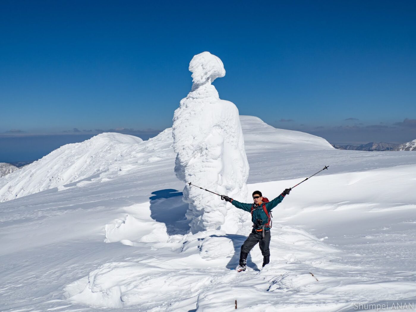 汗だくになりながら、足首上まで沈む雪を踏みしめながら、登る、登る……。