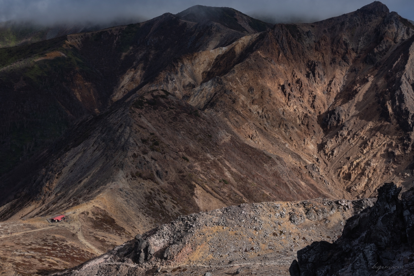 朝日岳と峠の茶屋跡避難小屋が見える。荒々しい山肌の中にポツンと佇む山小屋が目立つ。