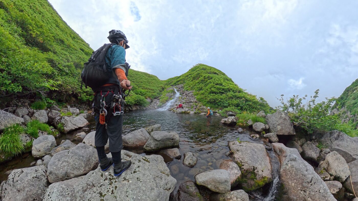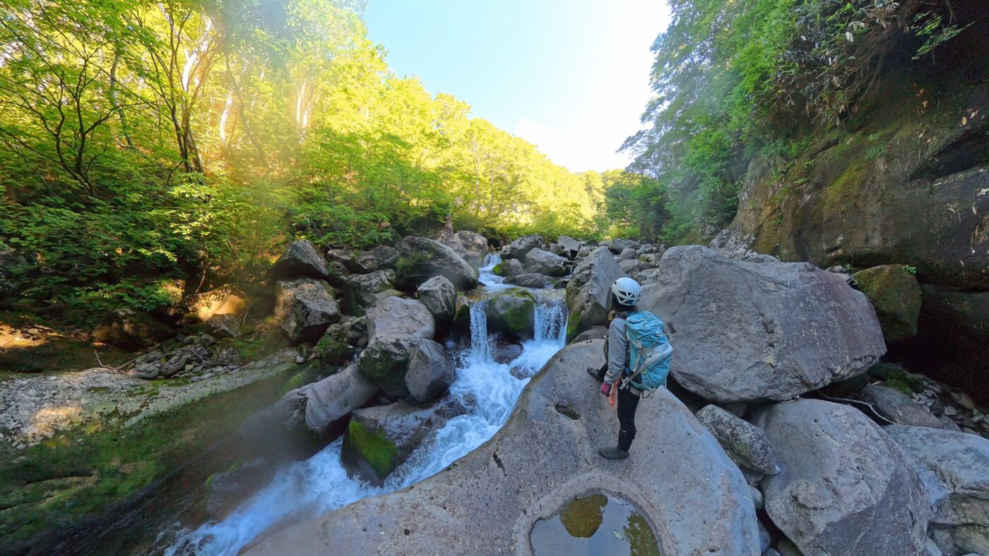 その後、月山沢の出合を過ぎ、二段滝を巻くように再度入渓。