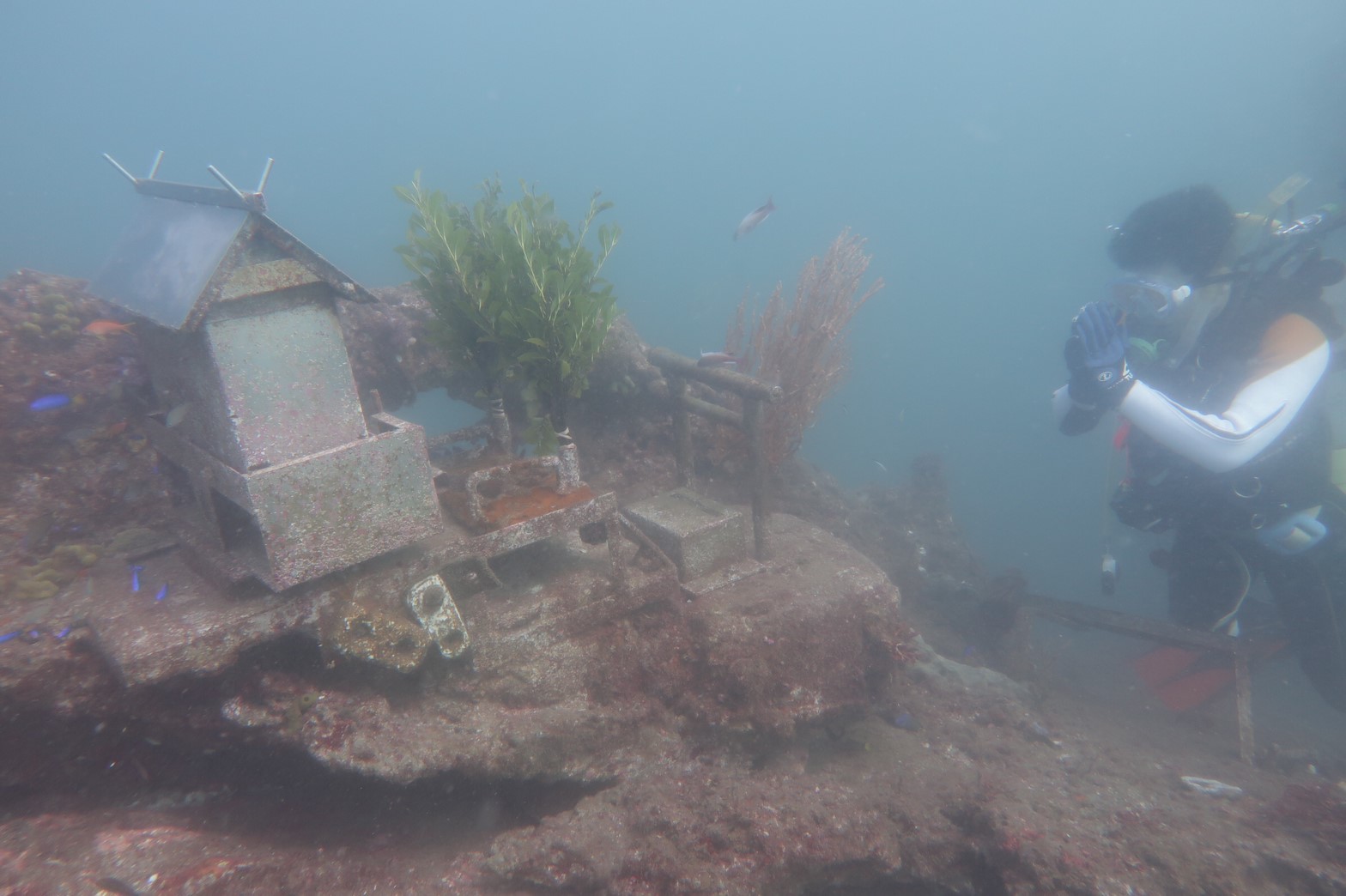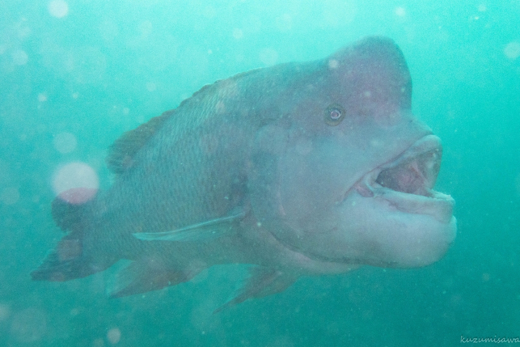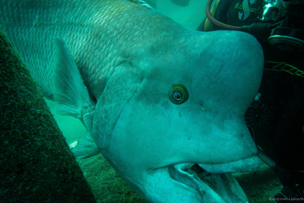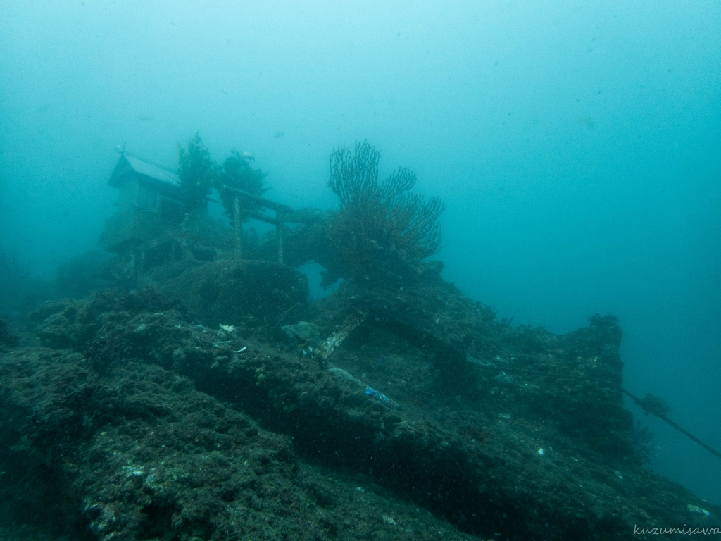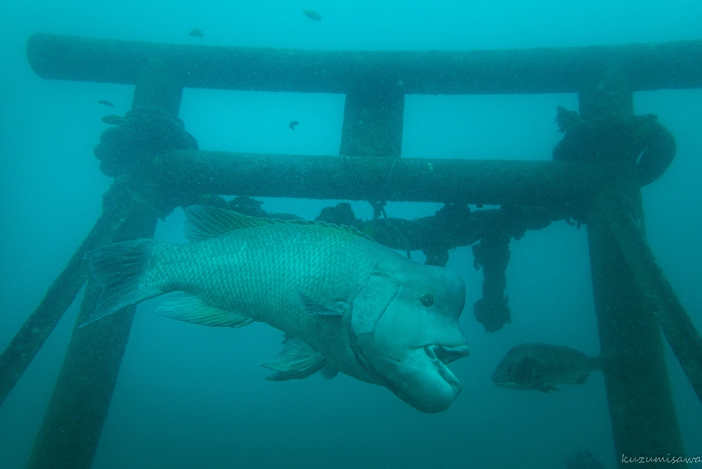 二日目は宿からすぐの波左間でのダイビング。計2回のダイブで、1回目は波左間の海中神社です。ボートからバックロールエントリーで海へ入り、そのまま潜行していくとうっすらと鳥居が見えてきました。鳥居と一緒に見えてきた大きなコブダイ、名前は「ヨリコ」というらしくとても人に懐いコブダイです。常に鳥居の周りを回遊しており、被写体力の高いヨリコです。
