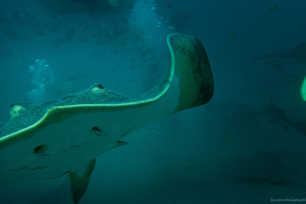船からロープに捕まり深度18mまで潜っていくのですが、潮の流れがまあ早くロープに捕まることに必死でなかなか潜っていくことができません。ロープを離してしまえば潮の流れとともに吹っ飛んでしまうでしょう。流れに抗いながら下降していくと、海底は穏やかな平和な海。アカエイがお出迎いしてくれました。