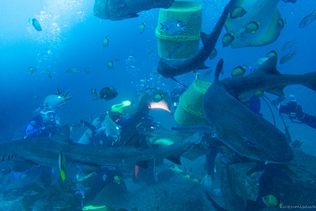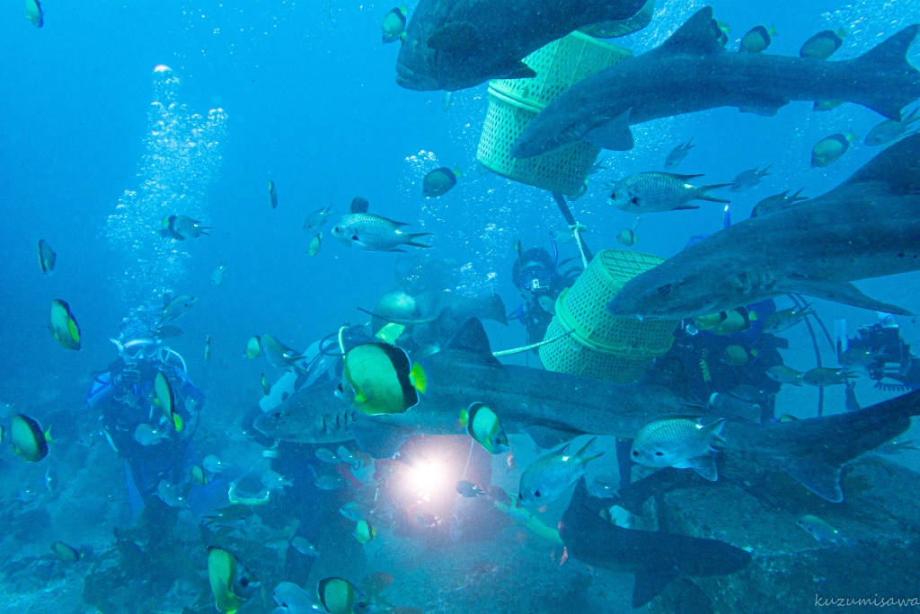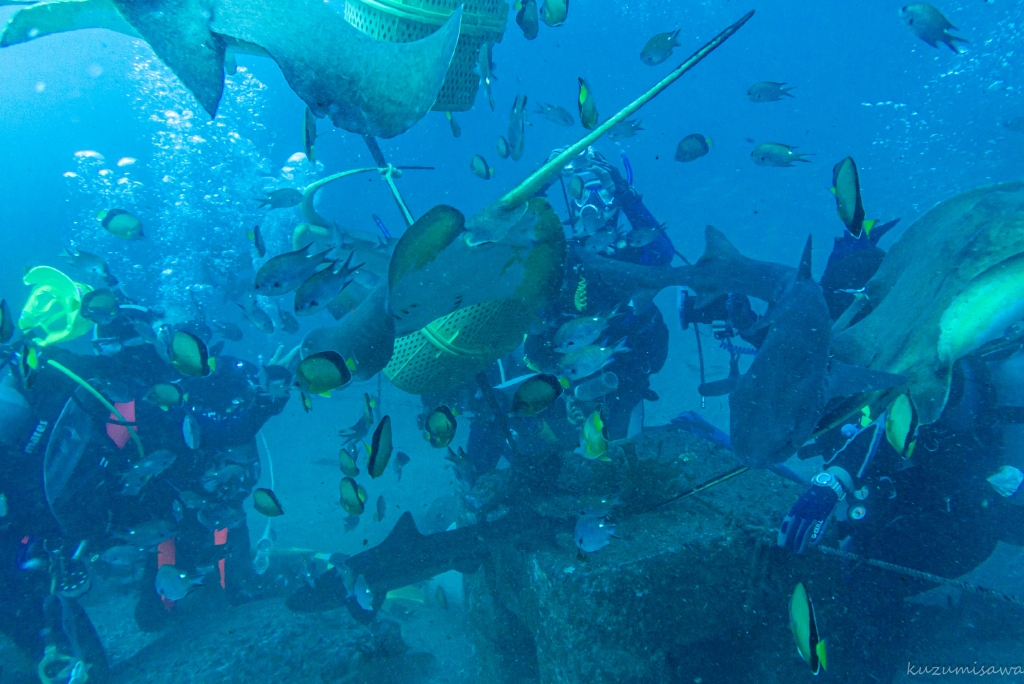 このポイントは「前沖根 シャークシティー」と呼ばれるポイントでシャークスクランブルというドチサメの乱舞を見ることができるポイントです。もともとこのスポットはドチザメをエサでおびき寄せて漁の邪魔にならないようにしたら、思いのほかドチザメが集まりダイビングスポットになったそうです。今では「アカエイ」「クエ」「コブダイ」「ドチザメ」が大量に集まる人気ダイビングスポットとなりました。この日も多くのダイビンググループが潜っていました。