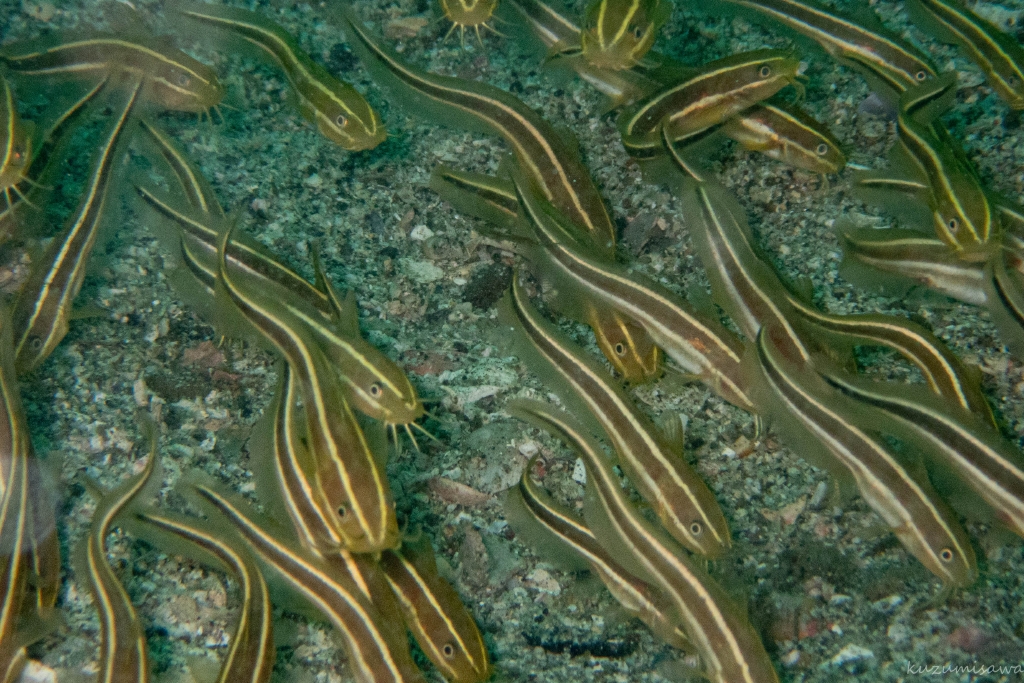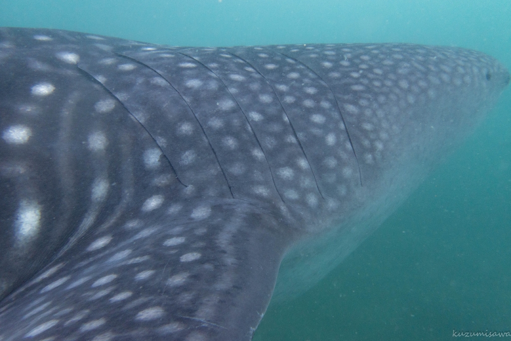 ジンベイの名前に由来である「甚平柄」もしっかり見ることができました。余談ですが、宮城県金華山の伝説に「ジンベイサマ」という妖怪?が出てくるのですが、その正体はジンベイザメではないかと言われております。まさかジンベイザメと一緒に泳げる日がくるとは思いませんでした!大興奮のダイビングとなりました。