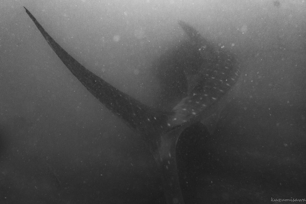 視界に飛び込んできたジンベイザメ!急いでカメラを用意して写真を撮るも尾びれしか撮れず…大きさは6mくらいとのことでしたが、実際に目の前に現れると腰が引けますね。